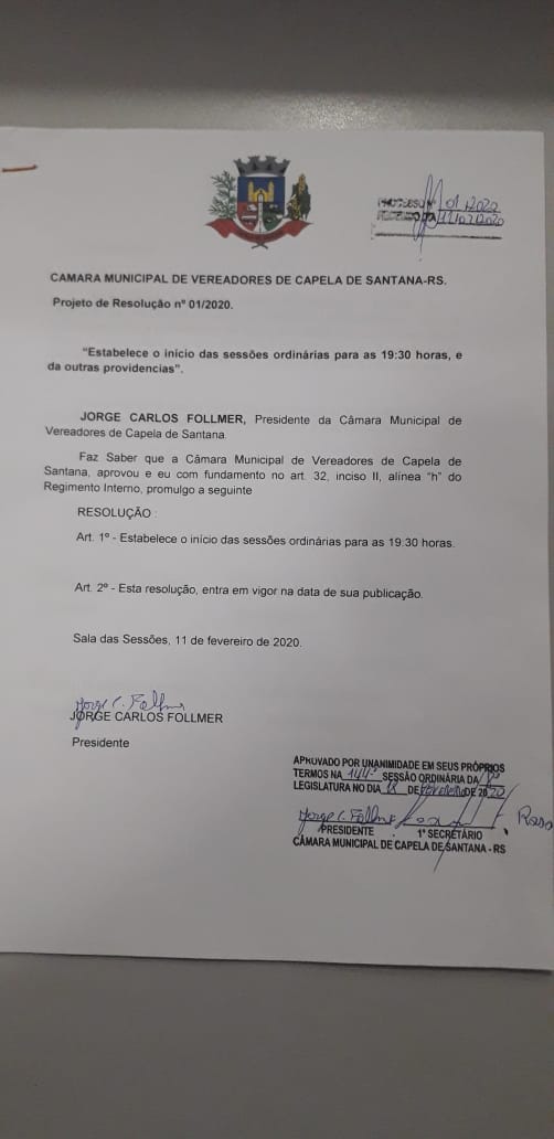 Em sessão Ordinária realizada na última terça feira 18 de fevereiro do corrente ano, foi aprovado por unanimidade, o Projeto de Resolução 01/2020, que estabelece o início das Sessões Ordinárias para ás 19:30