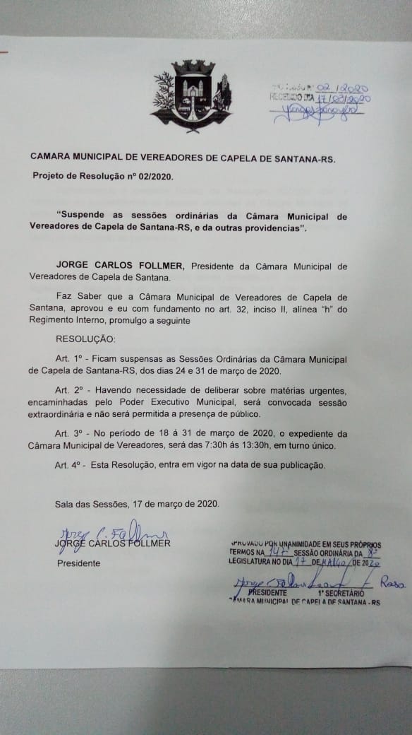 Na última sessão Ordinária realizada na noite de terça feira 17 de março do corrente ano, os vereadores aprovaram por unanimidade o projeto de resolução que Suspende as Sessões Ordinárias da Câmara Municipal de Vereadores de Capela de Santana, no período de 18 á 31 de março, desta forma estão suspensas as sessões que ocorreriam nos dias 24 e 31 de março. Medidas desta natureza, estão sendo tomadas por outros poderes como, Legislativo, Executivo, Judiciário entre outros, todos com objetivo de contribuírem, diante da grave situação de saúde pública, que é do conhecimento de todos. Informamos que neste período a Câmara Municipal de Vereadores terá horário reduzido, sendo este das 07:30 ás 13:30 sem fechar ao meio dia, desde já agradecemos a compreensão de todos, qualquer dúvida podem entrar em contato pelo telefone (51) 36982158.